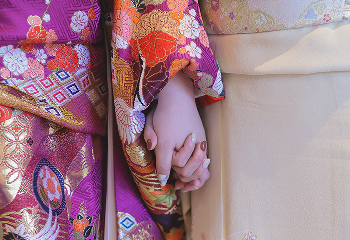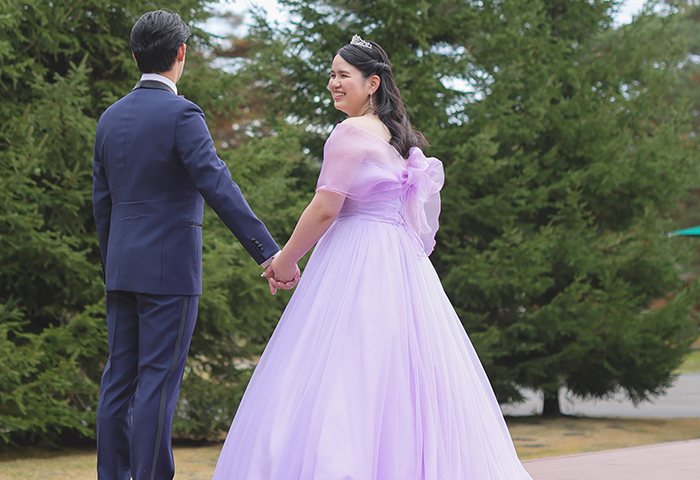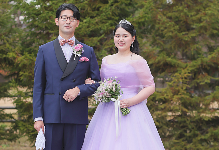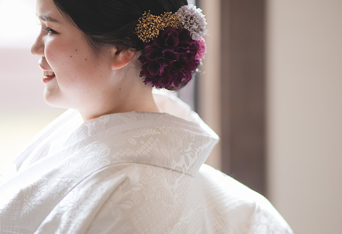 衣裳も紫をキーカラーに選び、色打掛とドレスの両方に取り入れました。