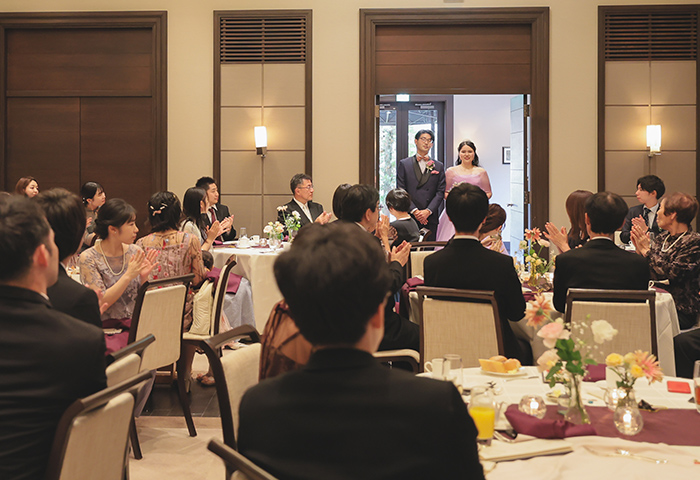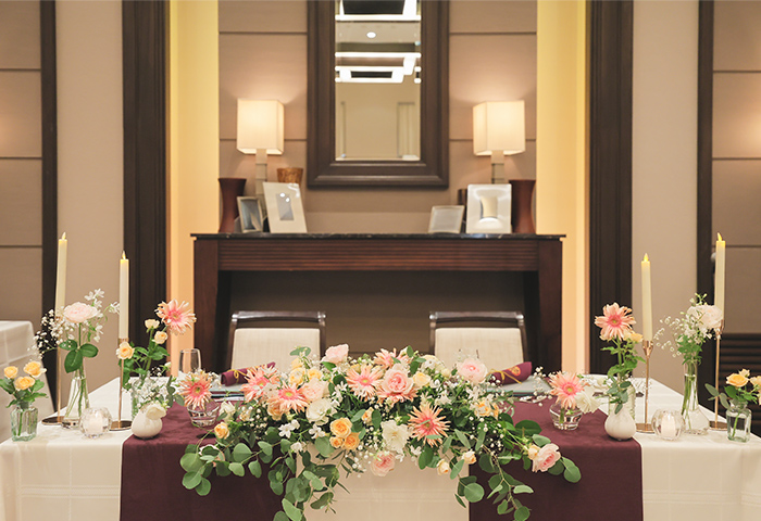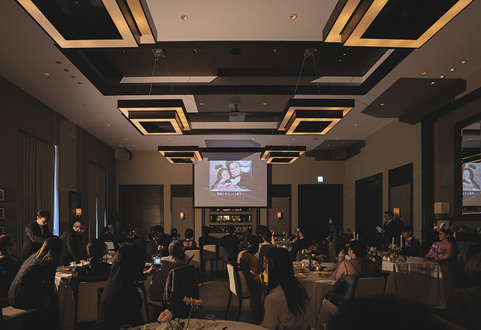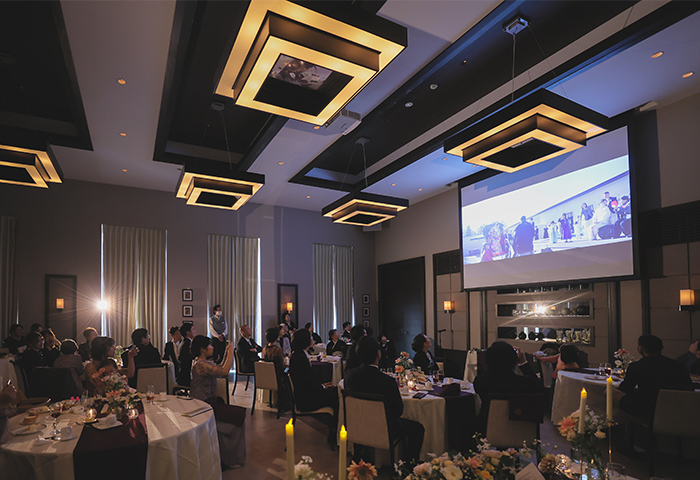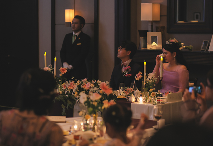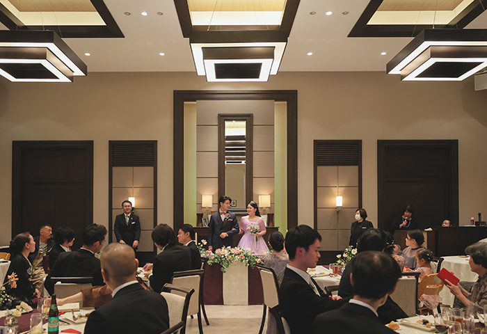 会場装飾や演出のテーマカラーには新婦の好きな紫を取り入れ、落ち着きと華やかさのある空間に仕上がりました。