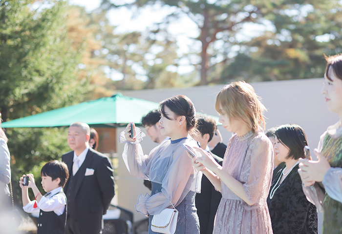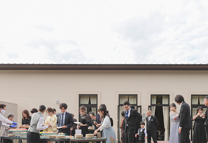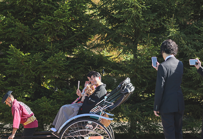 当日は天候にも恵まれ、快晴のもと人力車での登場やガーデンでのケーキバイキングなど、屋外での演出もすべて叶えることができました。