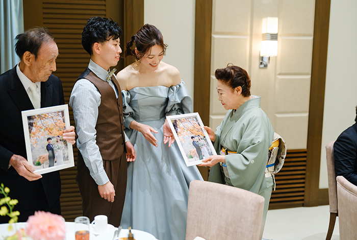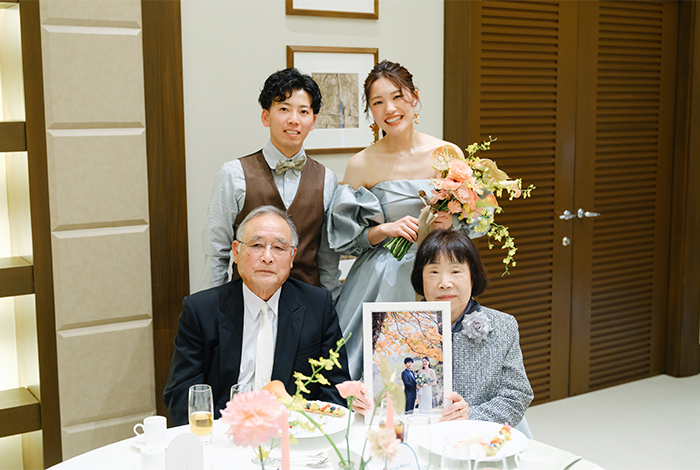 ゲストの皆さんからも「本当に素敵な式だったよ!」とたくさんお声をいただきました。特に、祖父母への写真のプレゼントはとても喜んでもらえて、すぐに飾ってくれていたのが何より嬉しかったです。