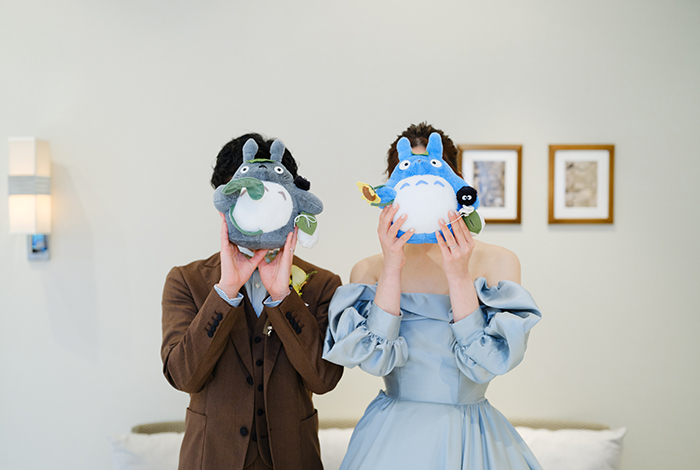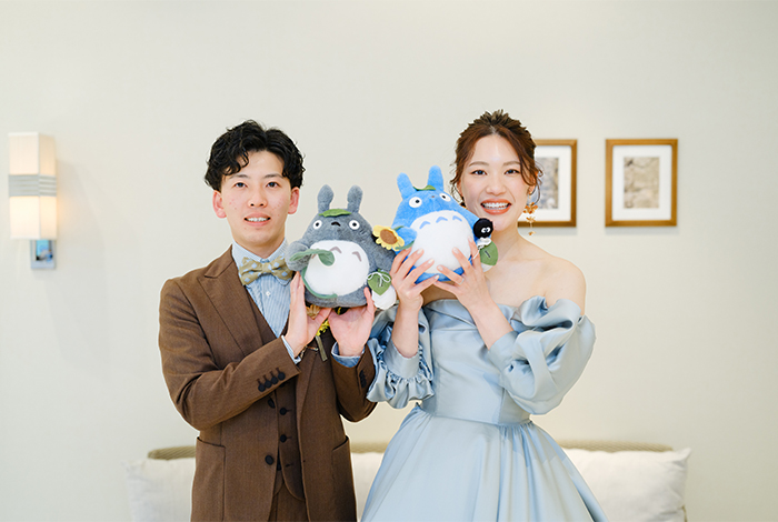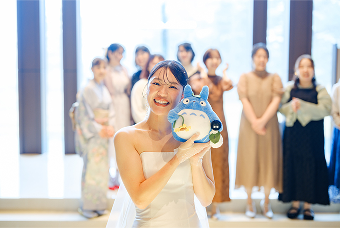 来てくれるゲスト全員に楽しんでもらいたくて、新郎新婦それぞれでぬいぐるみトスをしたり、祖父母には前撮り写真をプレゼント。友人卓には「写ルンです」を置いて自由に写真を撮ってもらうなど、みんなが笑顔になる工夫をたくさん散りばめました。