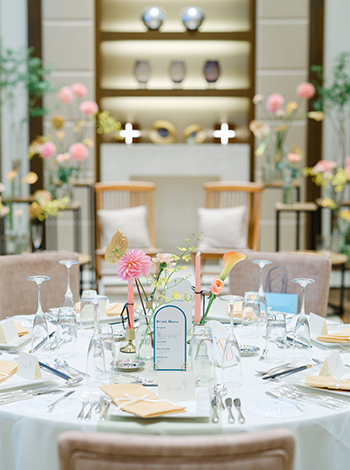 テーマカラーは春らしいパステル調。会場の装花や私たちの衣裳に合わせて、ゲスト卓のキャンドルやペーパーアイテムもトータルでコーディネートしました。ペーパーアイテムは手作りして、統一感のある明るく華やかな空間になったと思います。