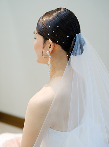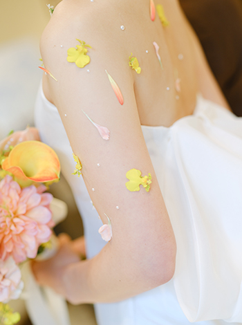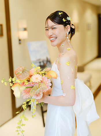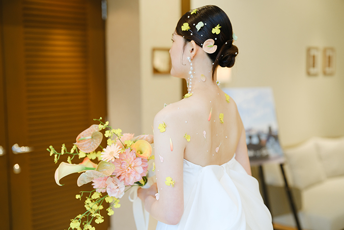衣裳選びも、春らしさを意識しました。ウェディングドレスはあえてシンプルなデザインにしつつ、お色直し前にはパールやお花をあしらったボディフラワーとヘアアレンジで華やかさをプラス。