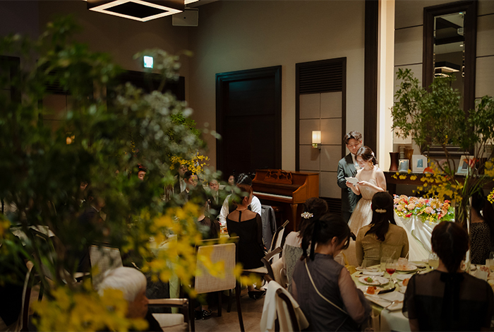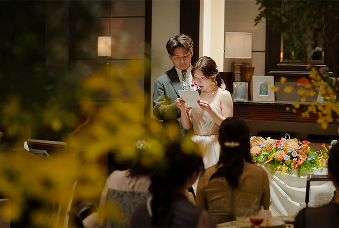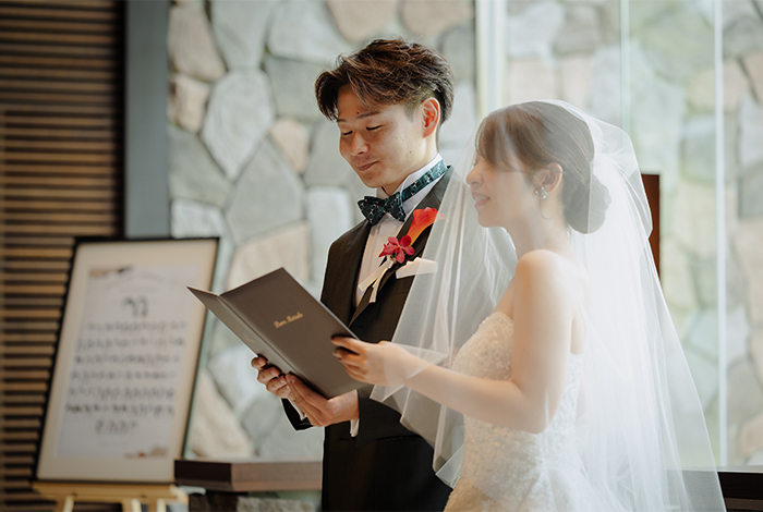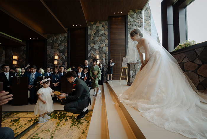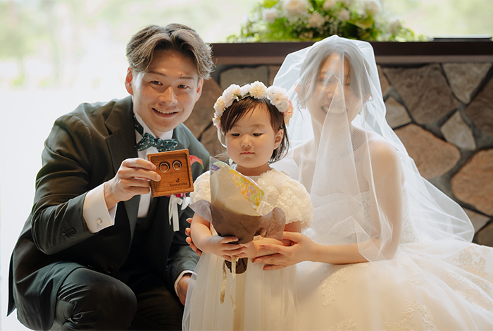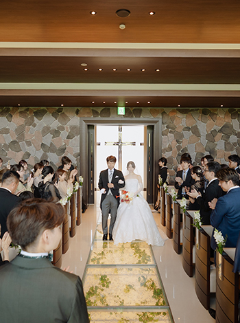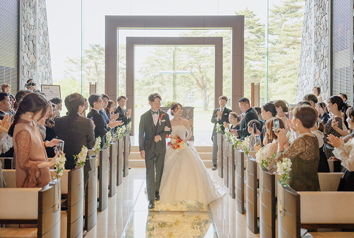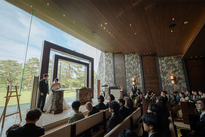 緑豊かな森に囲まれた開放的なチャペルは、自然光が差し込み、まるで映画のワンシーンのよう。スタッフの皆さんが私たちの希望やアイデアを丁寧に汲み取りながら支えてくださり、細部までこだわった演出を叶えることができました。