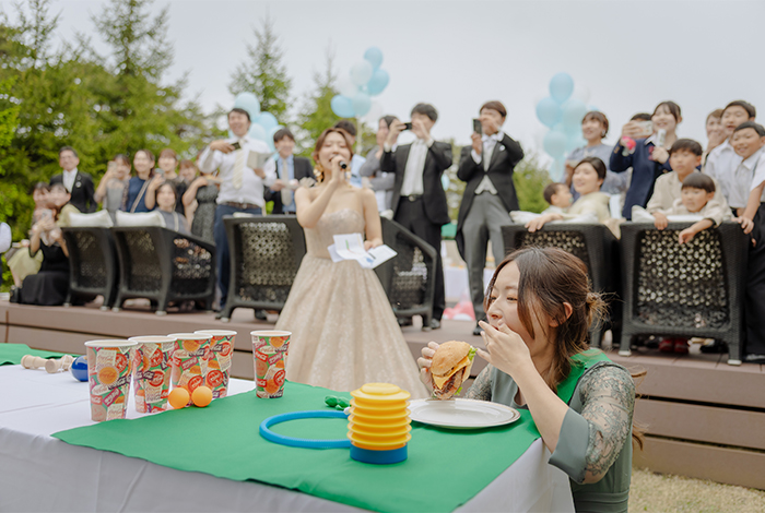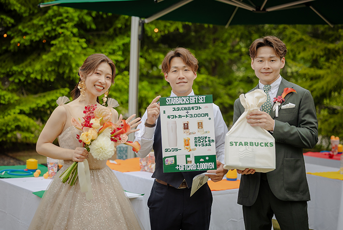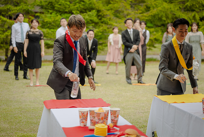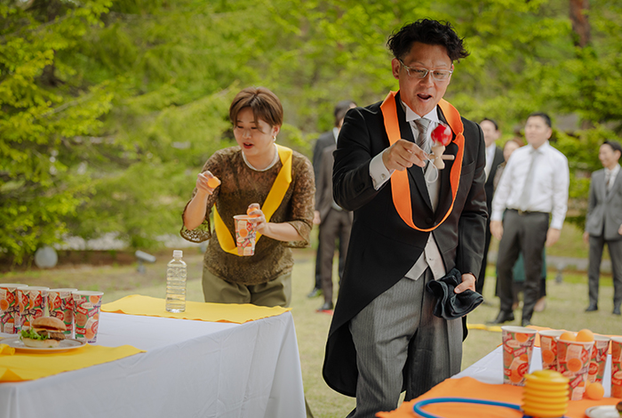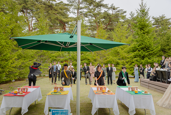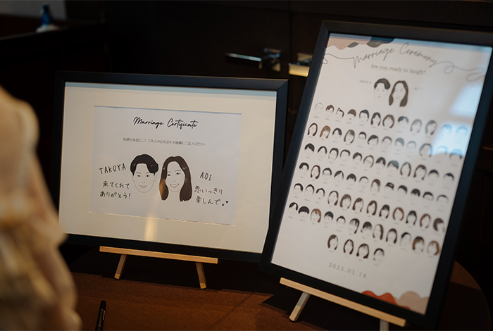 私たちの式に参加するすべての人が自然に、楽しい時間を過ごせるようにしたいと思い、型にはまらない、パーティーのような式をイメージしていました。ゲスト同士が自然に会話やコミュニケーションを楽しめるように、結婚証明書にゲストの似顔絵を用意して名前を記入してもらったり、ガーデンウエディングをイメージした屋外でのブッフェやミニゲーム大会を行いました。