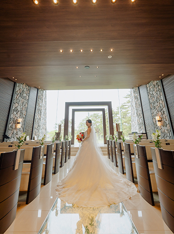 いくつかの式場を見学した中でも、フォレスターナ軽井沢は軽井沢らしさを一番感じられる場所でした。特に「光のチャペル」は開放的なガラスに映る自然がとても印象的で、緑あふれる木々と非日常感に包まれた空間に一目惚れしました。