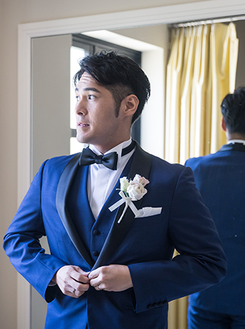 普段あまり選ばないカラーだったので、ゲストに楽しんでもらえるようカラードレス当てクイズを実施。案の定、正解者がほとんどおらず(笑)、意外性でとても盛り上がりました!新郎のお色直し衣裳は、カラードレスに合わせて選んでくれたものです。