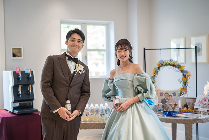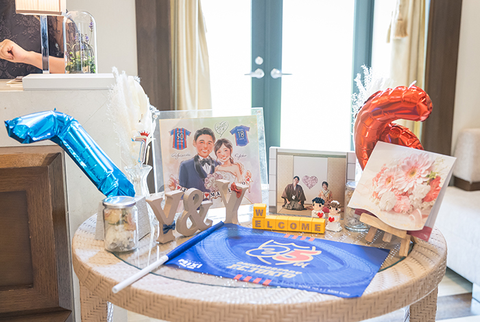 東京から来てくださるゲストばかりだったので、東京ではできない体験をして楽しんでいただきたいと思っていました。テーマカラーは、明るい雰囲気に合う黄色とオレンジ。選曲も明るく元気な音楽でほとんど構成しました。また、夫婦でサッカーのサポーターをしているので、ムービーや入場曲、縁起物などにもサッカーを連想させる要素をたくさん取り入れました。