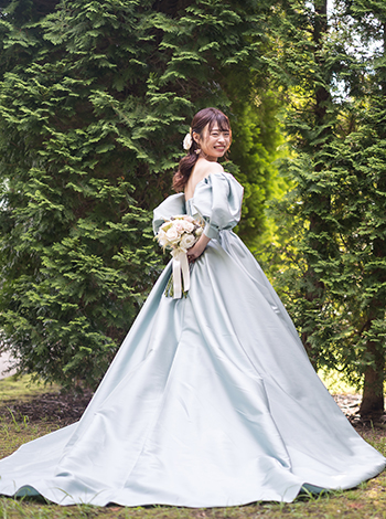 カラードレスは最初、黄色を着たいと思っていたのですが、コーディネーターさんから「ブルーグリーンが似合いそう」とご提案いただき、試着してみたところ、黄色よりも自分にしっくりきて、珍しい色味やデザインにも惹かれて即決しました。