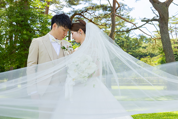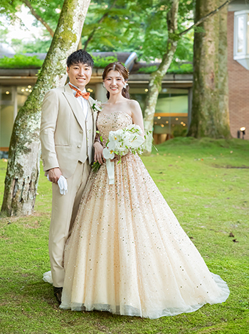 新郎のタキシードは、雰囲気が明るくなるカラーを選びました。夏らしく軽やかで、自然光の中でも映える色合いが気に入っています。