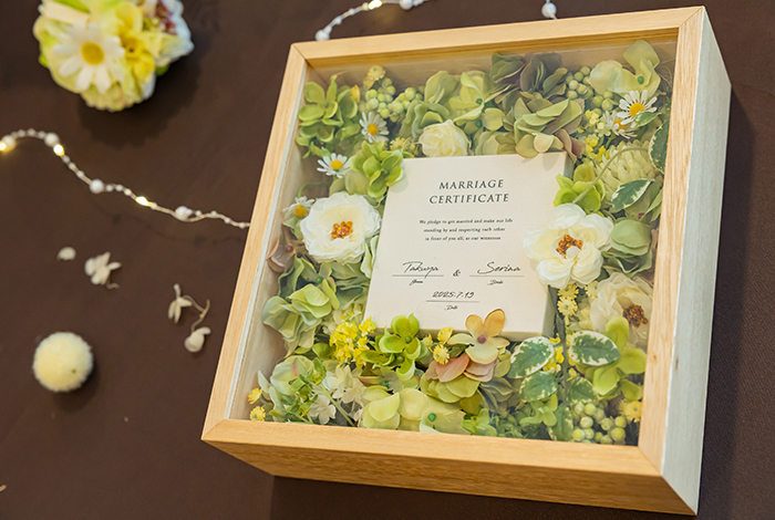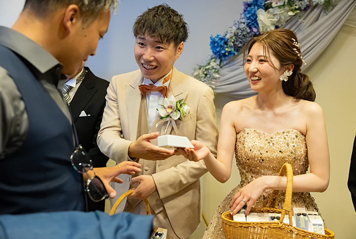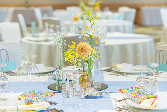 夏の挙式だったので、装花やアイテムにサマーカラーを多く取り入れ、明るく爽やかな雰囲気を意識しました。そして、来てくれたゲスト全員が楽しめるように、参加型の演出をたくさん取り入れました。