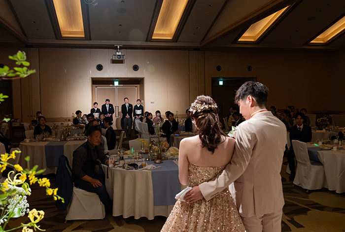 披露宴会場が広かったので、空間に映えるようにボリュームのあるドレスを選びました。