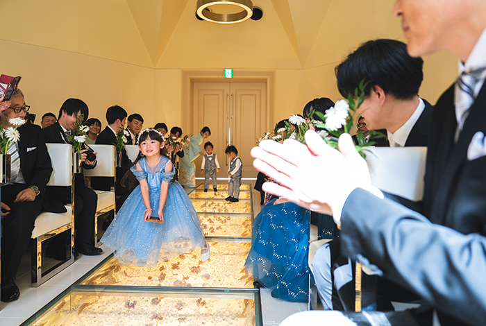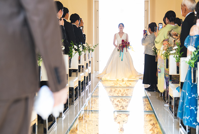 見学で特に心を惹かれたのが、季節の花々で彩られたバージンロード。光が差し込んでキラキラと輝くその景色がとても印象的で、「ここを歩きたい」と自然に思えました。