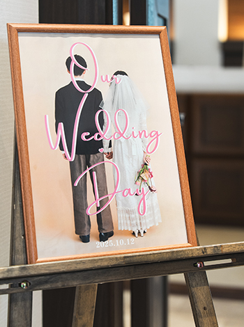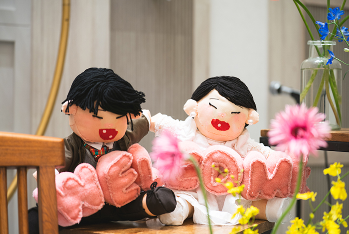 従姉妹に前撮りの私たちをモデルに作ってもらったもので、衣裳までそっくりに再現してくれました。