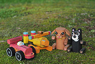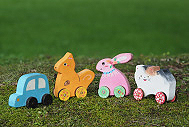 尾鷲ヒノキを使用。接着材を使わず、木とトンカチだけで組み立てます。動物の他、レーシングカー、ヘリコプターが選べます。