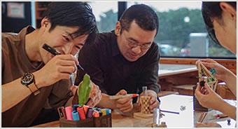 ⾃然豊かな軽井沢の森に暮らす野⿃に関するネイチャートーク実施後、野⿃図鑑を⾒ながら⾃分のお気に⼊りの野⿃を⾒つけて、⽊型と粘⼟、絵の具を使って世界に⼀つだけの野⿃のオーナメントを作成するプログラム。