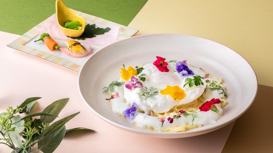 エディブルフラワーなどを散りばめてお花畑を連想するような可愛らしい見た目に仕上げた、カルボナーラ風うどんです。ふわふわとしたメレンゲと温度玉子がアクセントとなり、味わいをより一層マイルドに引き立てます。