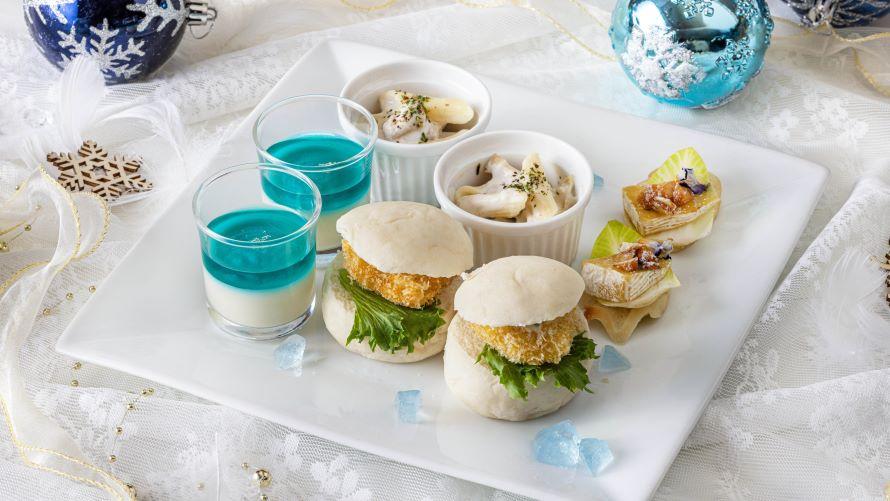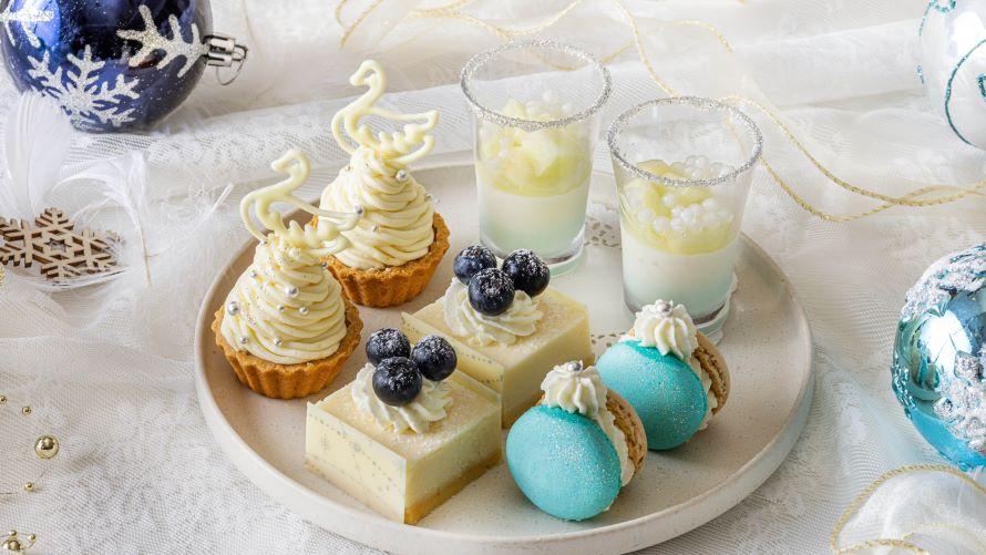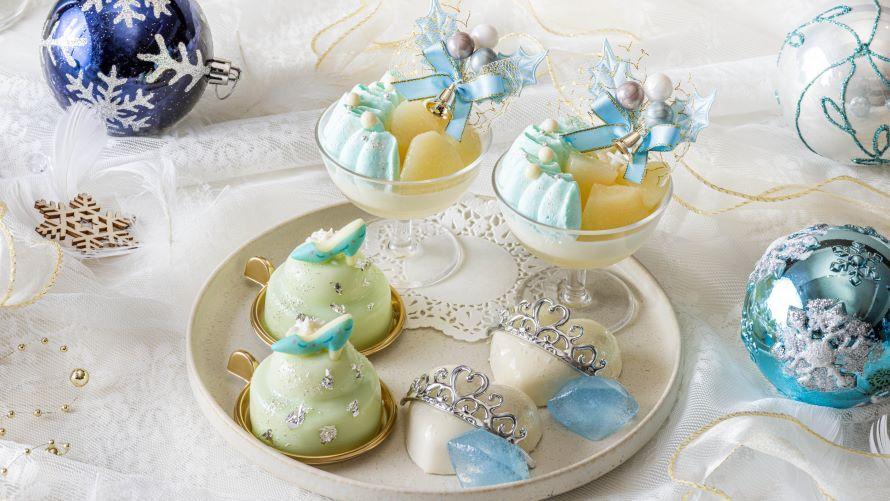 ドレスのフリルをイメージした鮮やかな水色が印象的な「はちみつレモンと洋梨のパフェ」や、銀箔をあしらい煌びやかなプリンセスの靴が可愛らしい「プリンセストゥ~青りんごムース~」など繊細で華やかなスイーツやセイボリーをお楽しみいただけます。
