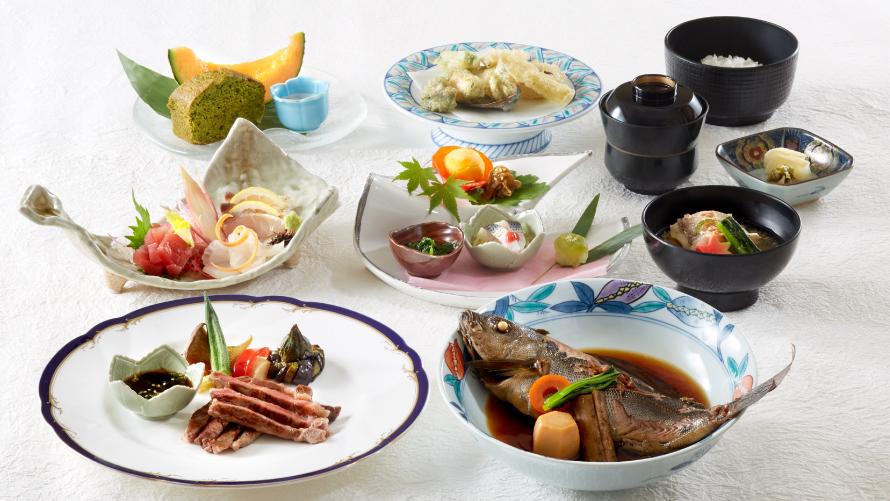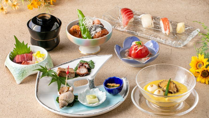 ステーキや握り寿司、鮑の煮物やお造りなど、前菜から甘味まで7品のおすすめ料理を集めた会席。