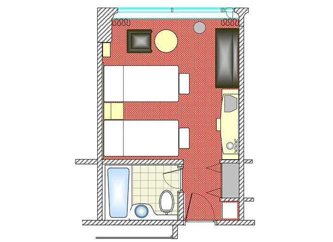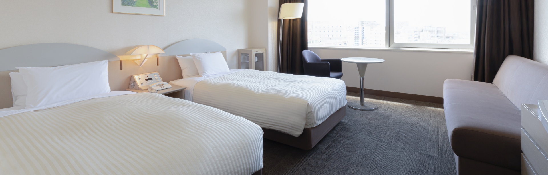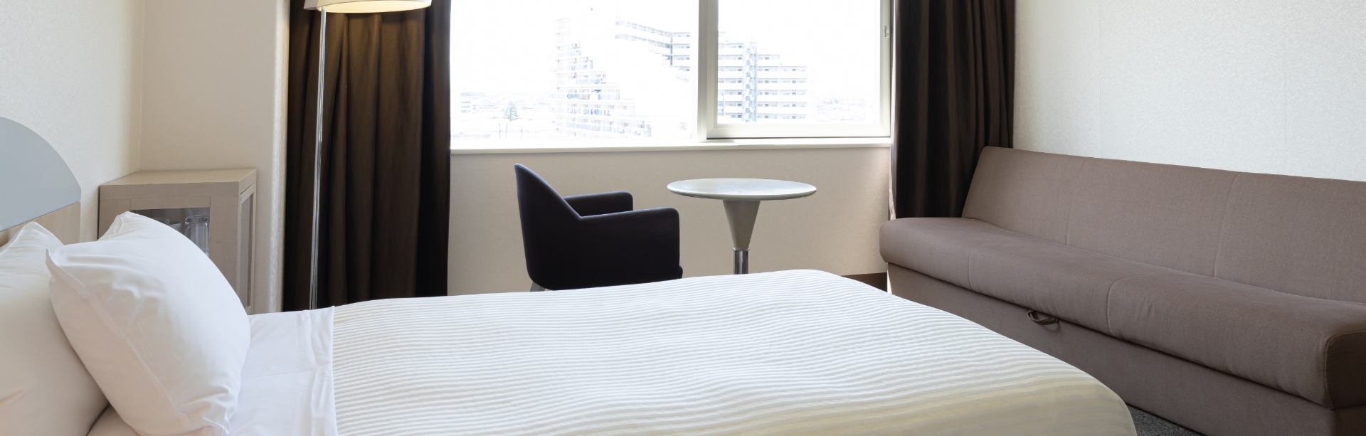 窓からは明るい陽光が差し込みます。室内には長いソファが入っており、ゆったりとおくつろぎいただけます。ソファはエキストラベッドとして3名さま利用も可能です。