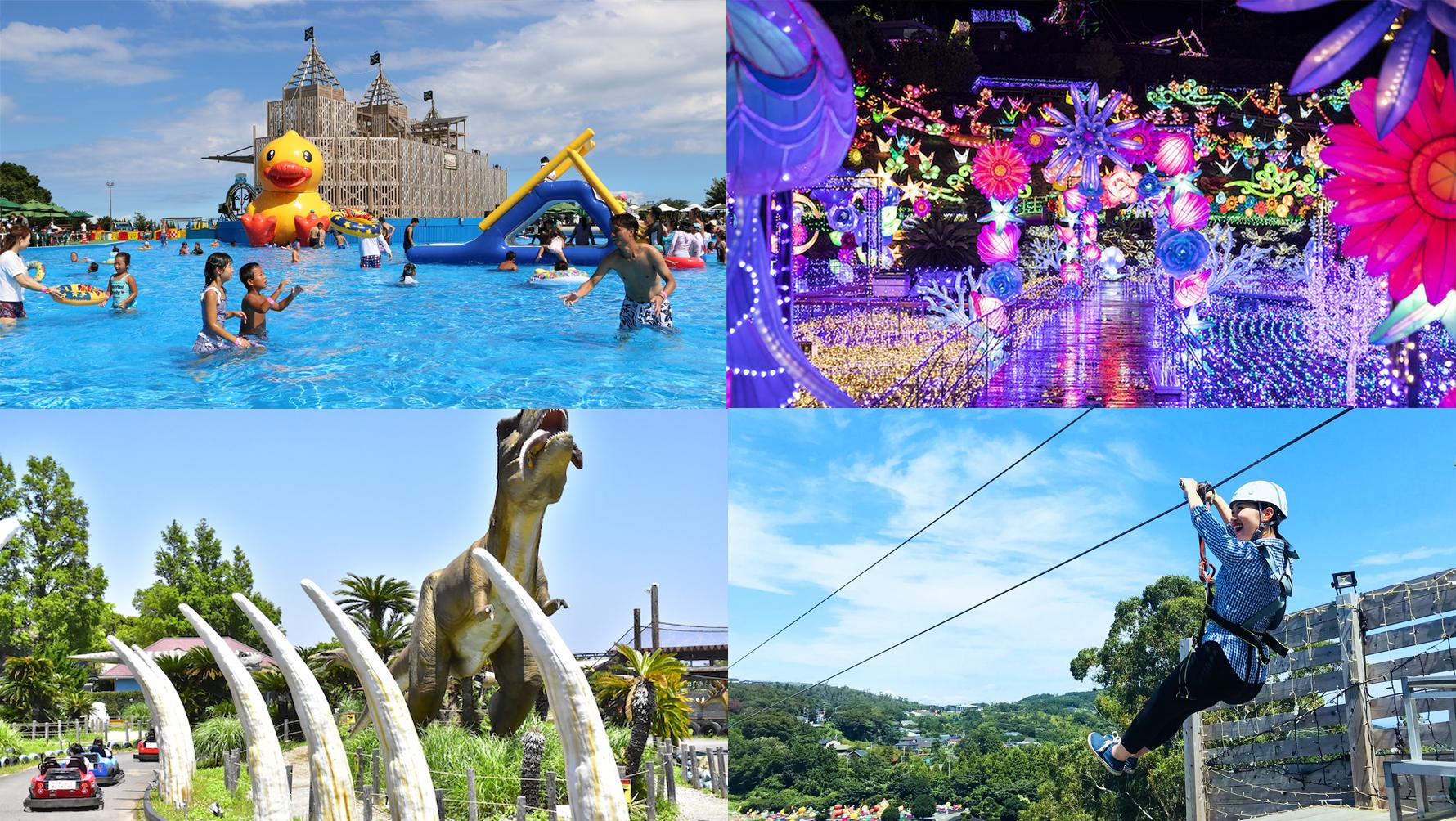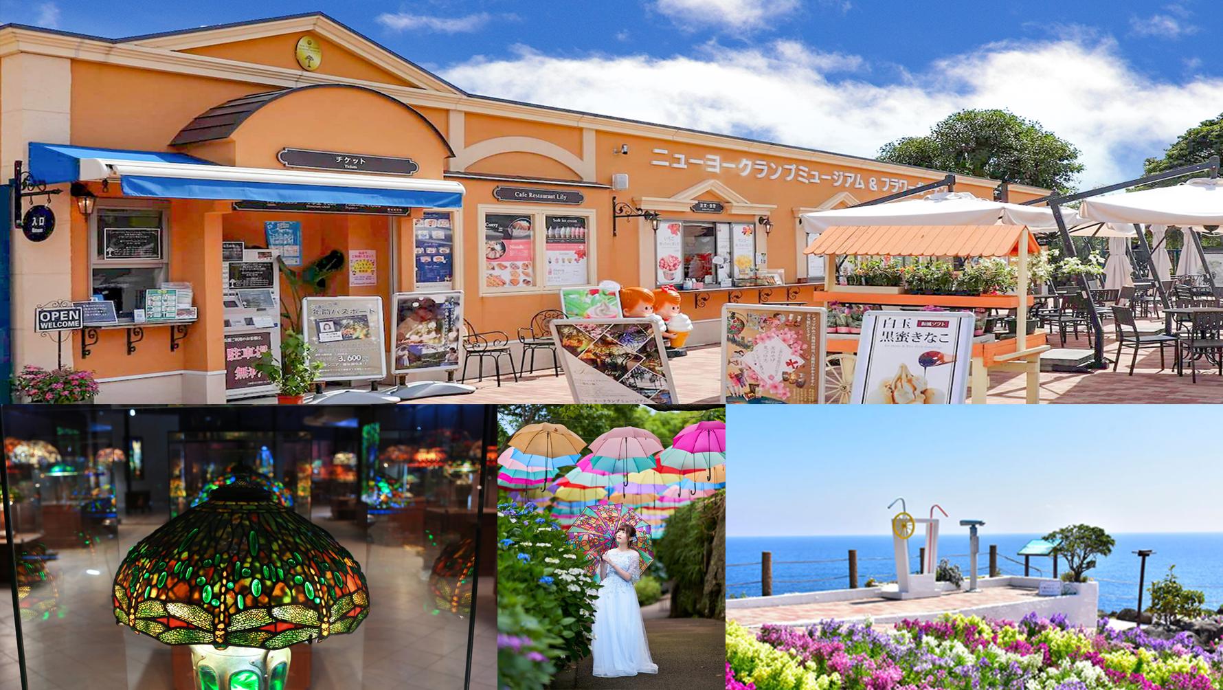 アンティークティファニーランプとカフェ。四季折々の花が咲き誇るフラワーガーデンの先に広がる城ヶ崎海岸の絶景を堪能することができます。