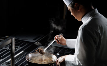 時代を超え、今でもいたるところに格式ある雰囲気が漂う川奈ホテル。明治時代に大倉喜七郎氏がイギリスに留学し、貴族たちが利用していたリゾート施設に感銘を受けたことによって開設され、リゾートホテルとして歴史が始まりました。中でも川奈ホテルの料理は国内外のお客さまを迎えるため、シェフたちが守ってきた「伝統の味とこだわり」があります。それは本物の味を守るため、味の要となるソース、スープ、ドレッシングなど全てを一から手づくりしてご提供すること。料理に向けたシェフたちの熱い情熱と受け継がれるおもてなしの心意気、川奈ホテルの料理の世界へご案内いたします。