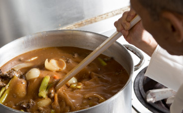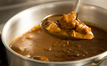 その昔、川奈ホテルはソースだけを専門に作るソース番がいました。今でも10種類以上のソースがあります。それほどまでにソースにこだわりを持ち続けています。創業以来、シェフたちが守り続けてきたソースはもちろん全て手づくり。その中でもキラキラと黄金色に輝くコンソメスープは、4日間かけ丹精込めて煮込んで出来あがる逸品です。澄んだ黄金色のスープはごまかしの効かない本物の味。このコンソメスープを使い、さまざまな具材を入れて、さらに1〜2週間煮込んで出来あがるのがスパイスの香りが高いカレーソース、3週間煮込んで出来あがるのが具材がとろける濃厚なデミグラスソース、濃厚なウニの味が広がるクリームソース、香り高いトリュフソースも人気です。いつでも切らすことなく丁寧に作られるソースは、川奈ホテルのシェフたちが守ってきた揺るぎない伝統なのです。