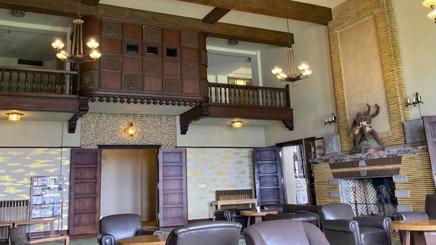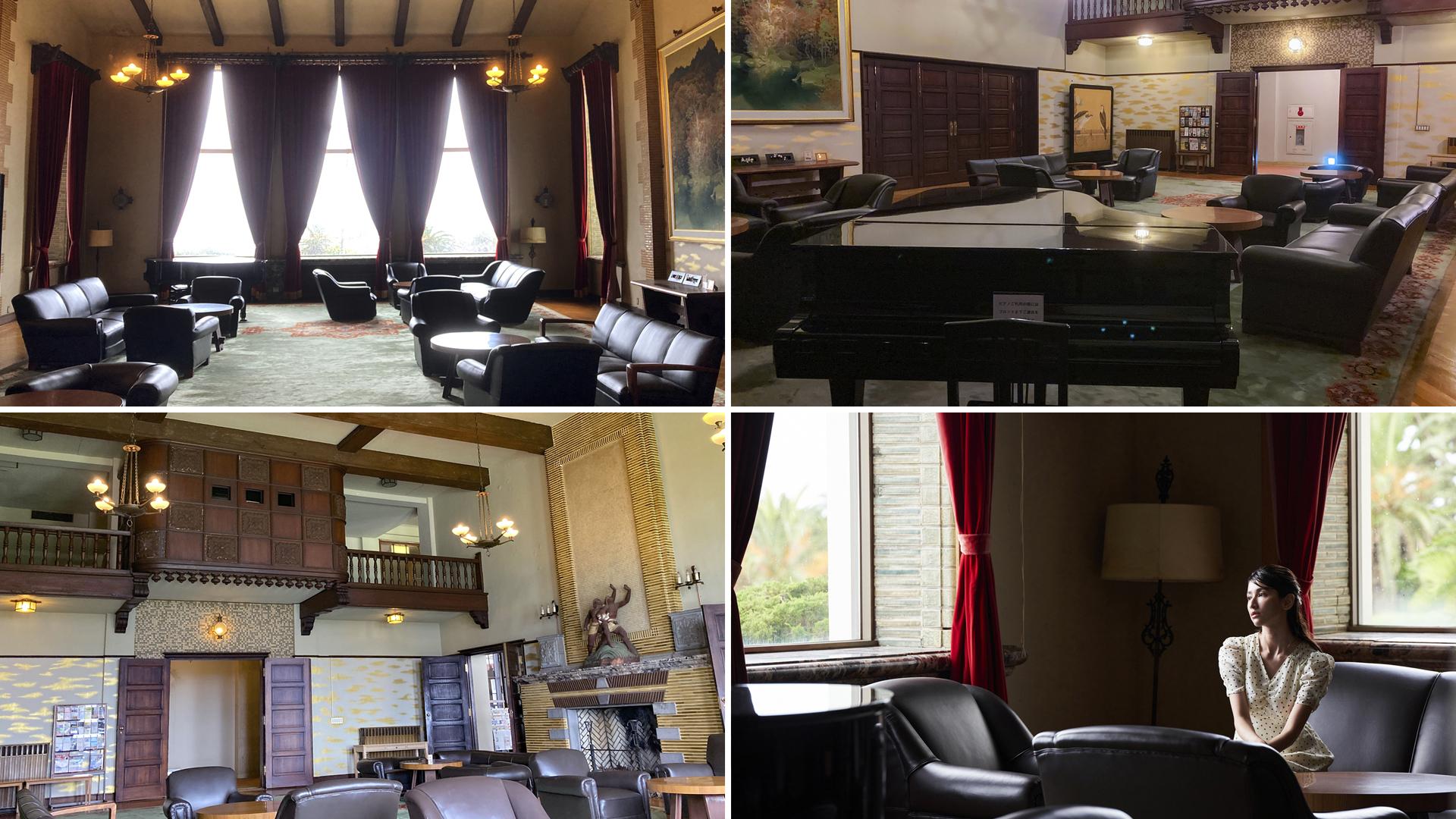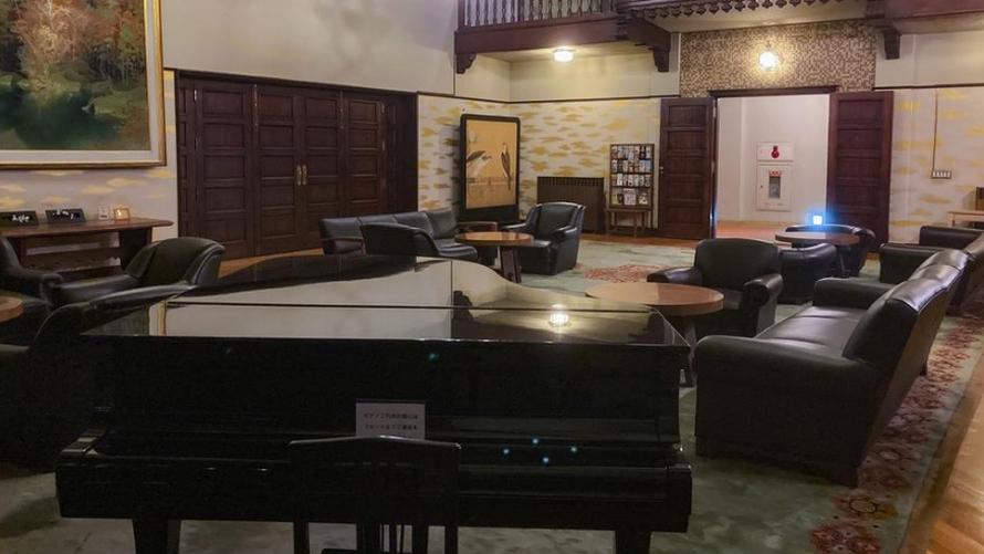 ピアノが設置された第2ロビー。入口上部には映写室があり、昔は上映会が開催されていた部屋で落ち着いた雰囲気となっています。
