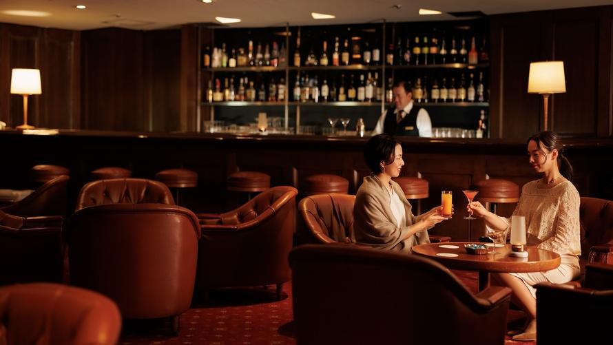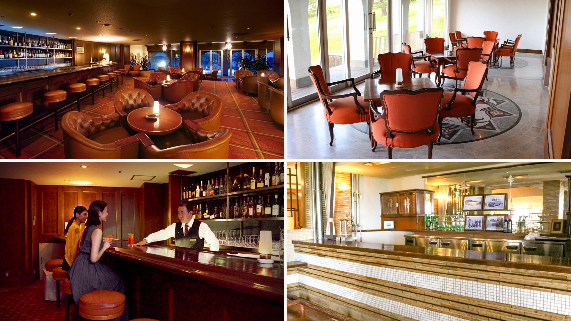 レストラングリルの入口にはレトロなグリルバー(写真右下)があります。昔ながらのスタンドバーで足元には足を乗せるための木製のバーがあります。使用されているタイルは竹の節をイメージして作られていると言われています。