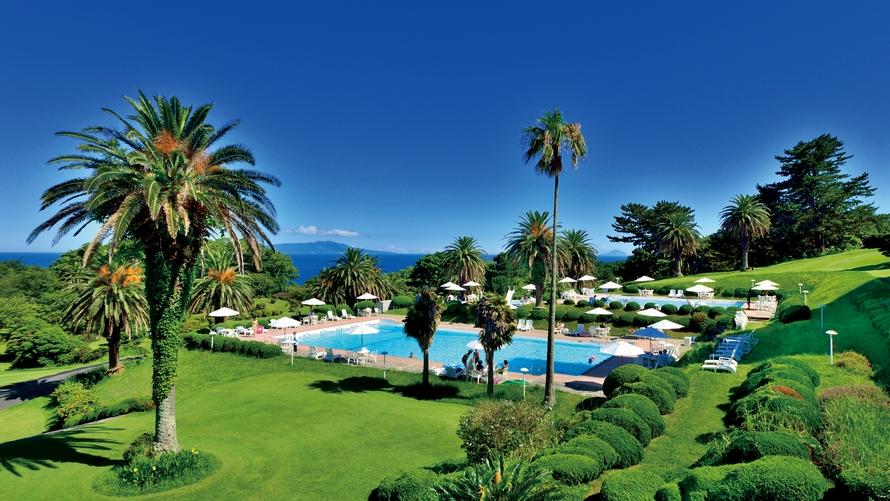 目の前に広がる海を眺められるリゾート感あふれる屋外プール。25m・15m・こども用プールがあります。