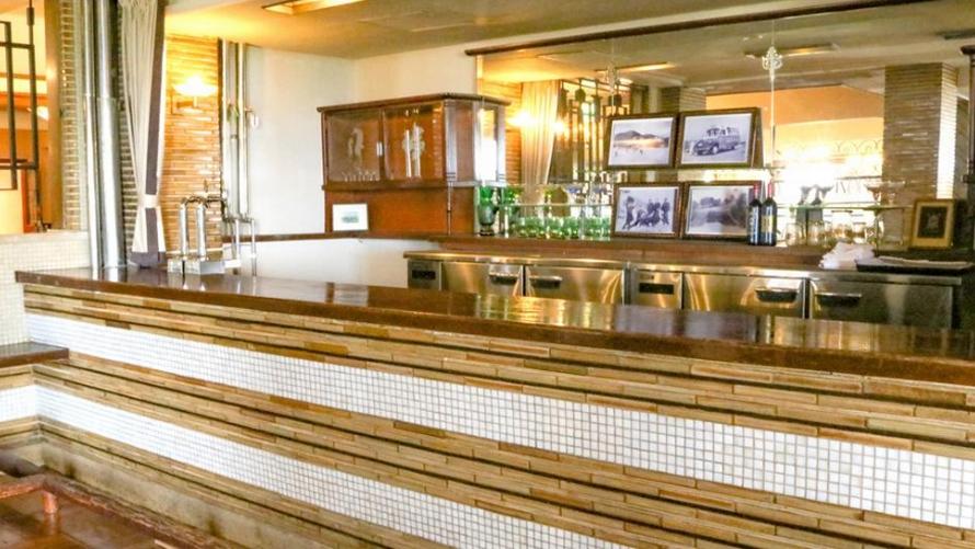 独特な雰囲気のあるカウンターテーブル席。テラス側には大理石のモザイクパターンが床に施工されており、有形文化財審査の際、非常に貴重なものと伝えられております。