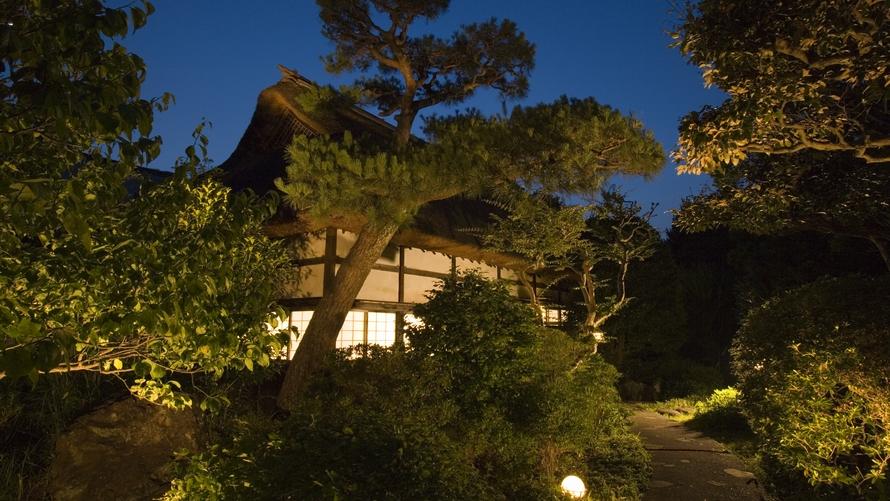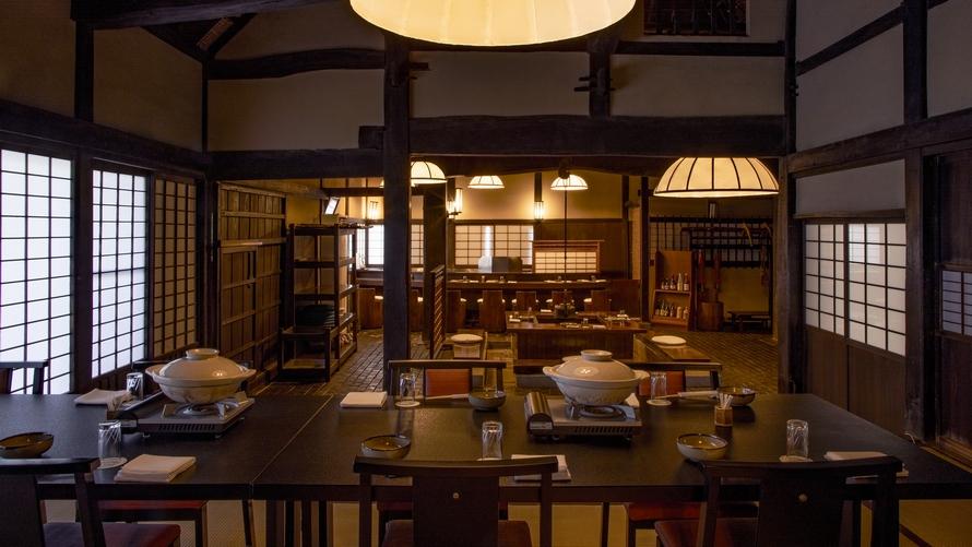 江戸時代中期に建てられた御殿場の大農家の土間部分を移築して造られた茅葺屋根の食事処です。中には囲炉裏、カウンター、座敷のお席がありお食事処として使用しています。