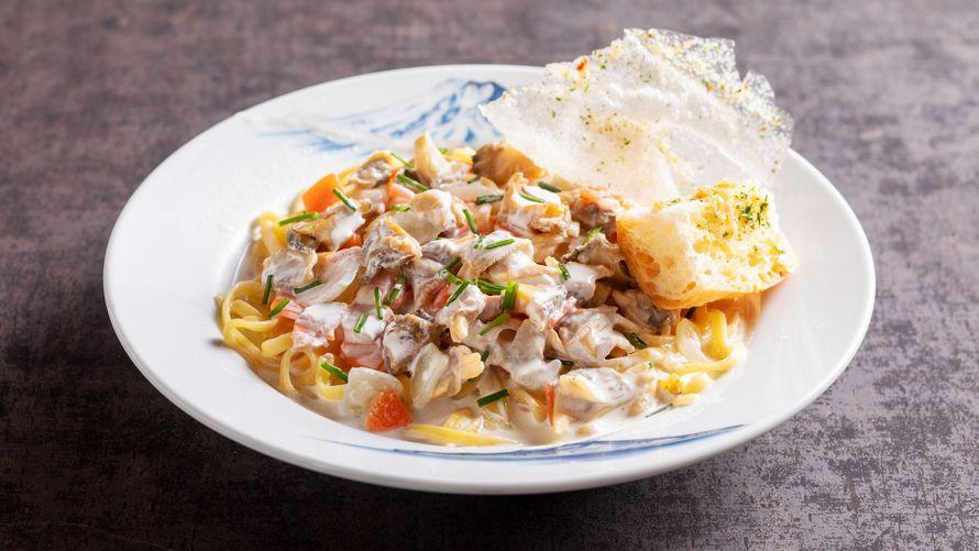 ロブスターの肉厚の歯ごたえ、帆立の甘さが引き立つ、見た目もインパクトのある人気メニューです。