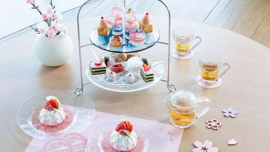 オーシャンビューの絶景パノラマカフェ「サンパーラー」で、桜をイメージした桜スイーツプレート、桜ハーブティー、限定桜コースター、限定桜マットで早春の春爛漫の川奈を五感でお愉しみいただけます。