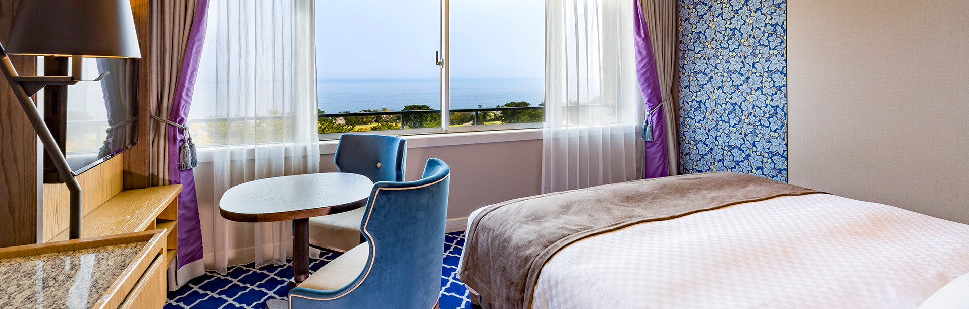 ベッドにいながら雄大な自然を堪能でき、ワイドな窓から見える優雅な伊豆の海をお部屋でお楽しみください。