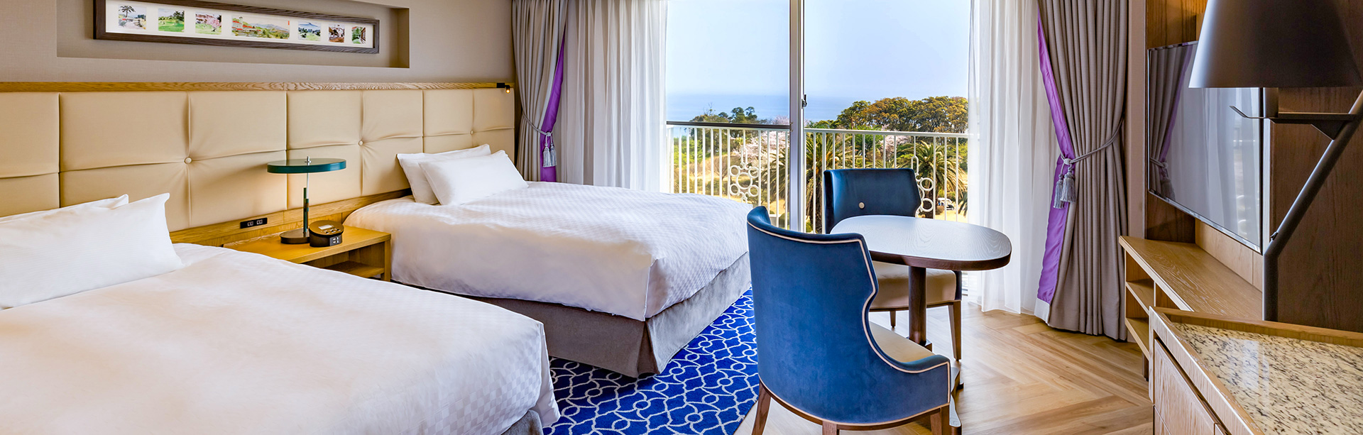 外に目を向ければ目の前に広がる相模灘と伊豆の島々。おだやかな海と伊豆大島を望む開放感あふれる海側のお部屋です