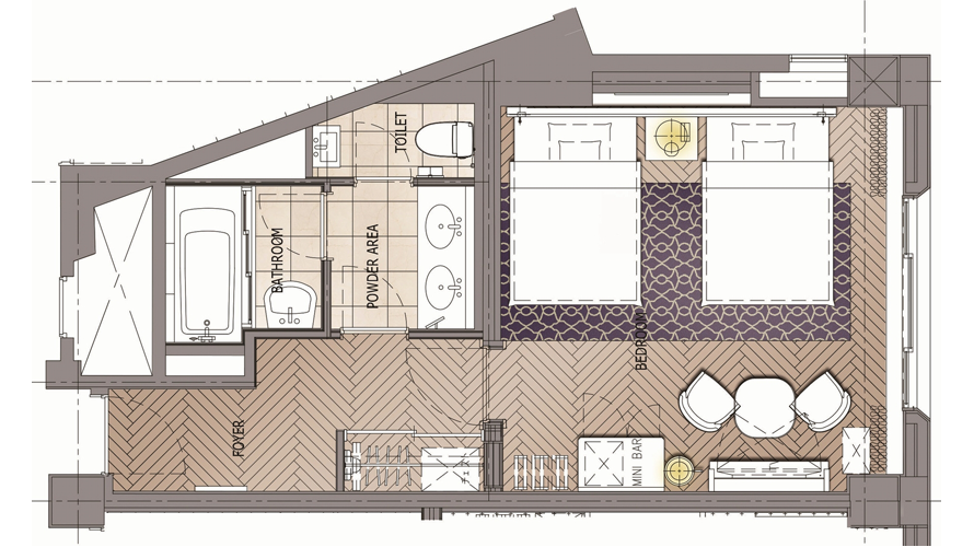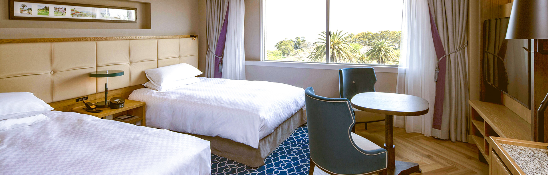 ベッドはゆったりお寛ぎいただけるようにワイドサイズベッド2台をご用意