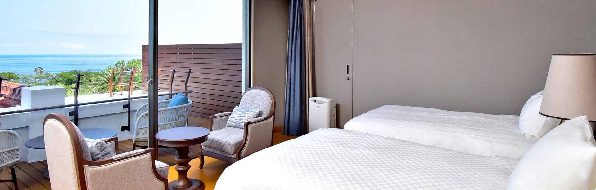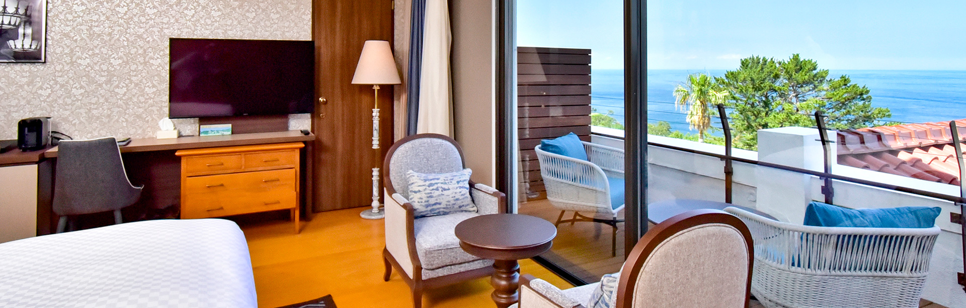 おだやかな海と伊豆大島を望む開放感あふれるオーシャンビューのお部屋でお寛ぎ下さい。美しい景色が心を癒やしてくれることでしょう。