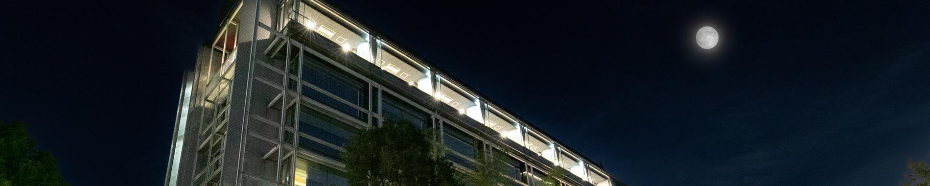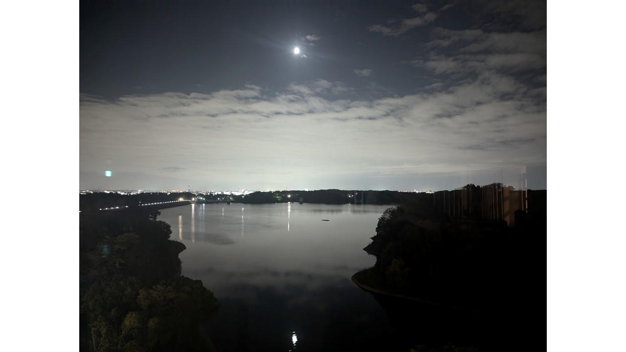 静けさの中、湖上に浮かぶ月、その光に照らされる水面、道路の灯、遠くの街明かりなどが織りなす景色はまるで絵画のような美しさです。