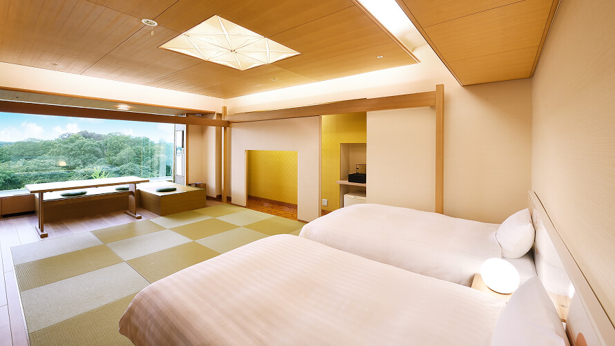 琉球畳のしつらえで湖の眺望を最大限楽しめるオープンな居室を実現。和モダンベッドと木の和チェアのBタイプ