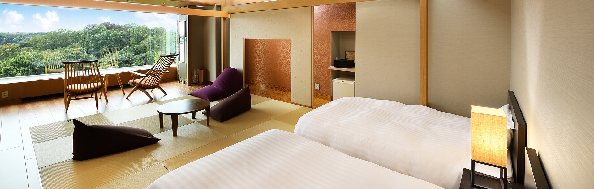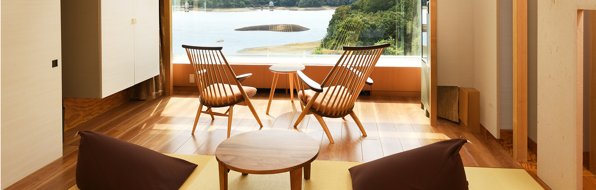客室最上階の5階、ゆったりとおくつろぎいただける、パノラマビューのくつろぎ和モダンルーム。