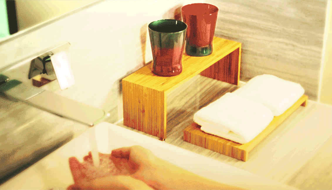 出来上がったのは、細い竹を幾つも繋ぎあわせた美しい形の洗面台でした。こだわりを伺ってみると、「水回りということもあり、腐食や色あせを防止するコーティング剤はいろいろ試しました。竹の持つ素材感を消さないよう、テカリの出ないマットな質感に仕上がるものを選んでいます」。計算し尽くされたかのようなサイズやデザインについては、「茶道にも通じる黄金比を採用しています。もともと茶筅(ちゃせん)や柄杓(ひしゃく)、茶杓(ちゃしゃく)など、茶道の道具には竹を用いたものが多い。竹工芸の原点は茶道具だといえます。主となる茶道具は、すべて寸法が定められており、配置すらも決まっているのです。見て美しく、空間にしっくりと馴染むバランス。その黄金比を用いて、サイズ感、厚みなどを導き出し、今回のホテルの水回りに映えるデザインに落とし込んでいます」。