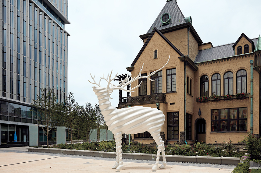 旧館を移築した歴史と風格ある「赤坂プリンス クラシックハウス」中庭には、あたかも守り神のように凛と立つ「WHITE DEER」(作 名和晃平)。