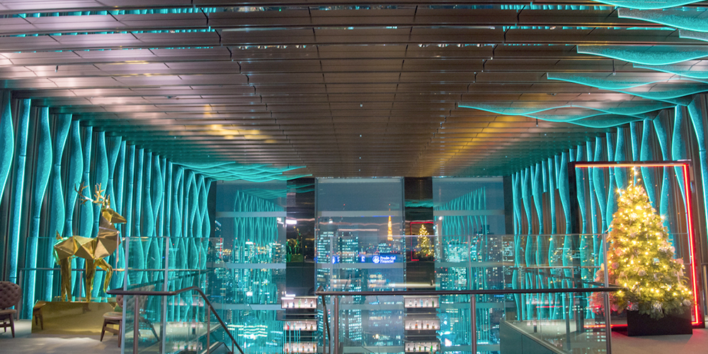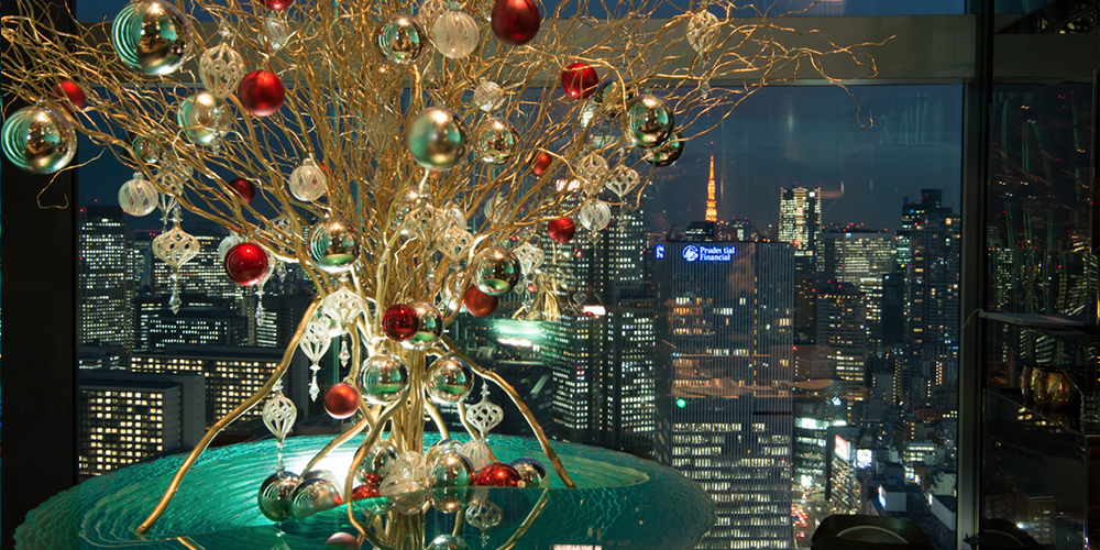特に、36階のクリスマスツリーは、地上140mという天空の浮揚感をイメージしたもの。メタリックフレームの中、クリスマスカラーの赤と 緑のライトに照らし出され、ツリーが幻想的に浮かび上がります。ちりばめたスワロフスキーの上質な煌めきも、“おとなのクリスマス”にふさわしい華やか さ。息づくモミの木の芳しい香りは、生命力の象徴とされた常緑樹ならではの強さも漂わせて。