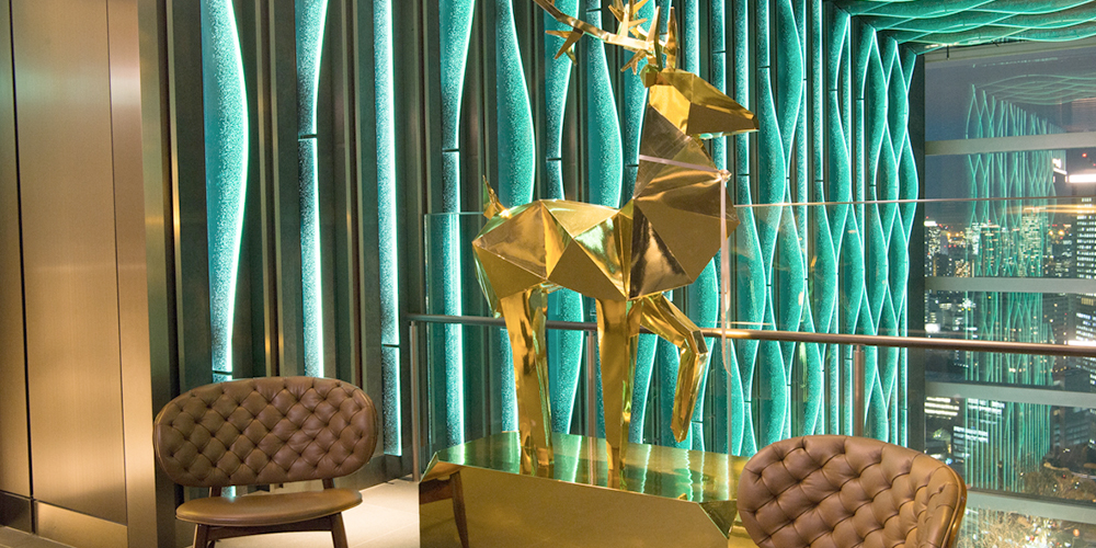 もうひとつ、あざやかな存在感を放つ金色のトナカイは、3D折り紙のオブジェ。気鋭の五感クリエイター・大髙啓二氏によるディレクションで 誕生しました。平らな紙から自在に形を変え、陰影ある姿へとはばたく折り紙オブジェは、日本古来のカルチャーをコンテンポラリーアートに昇華させたもの。