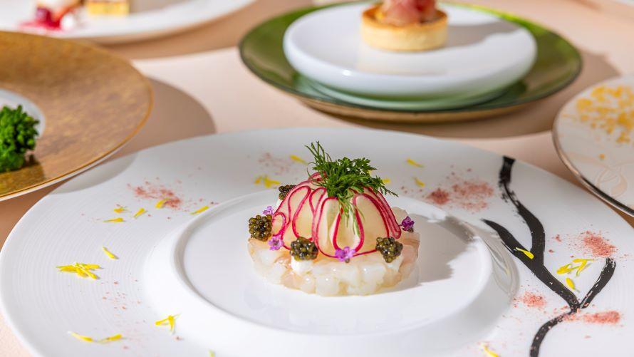 カリフラワームースとボタン海老 甲殻類のジュレ キャビアのアクセント