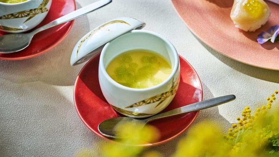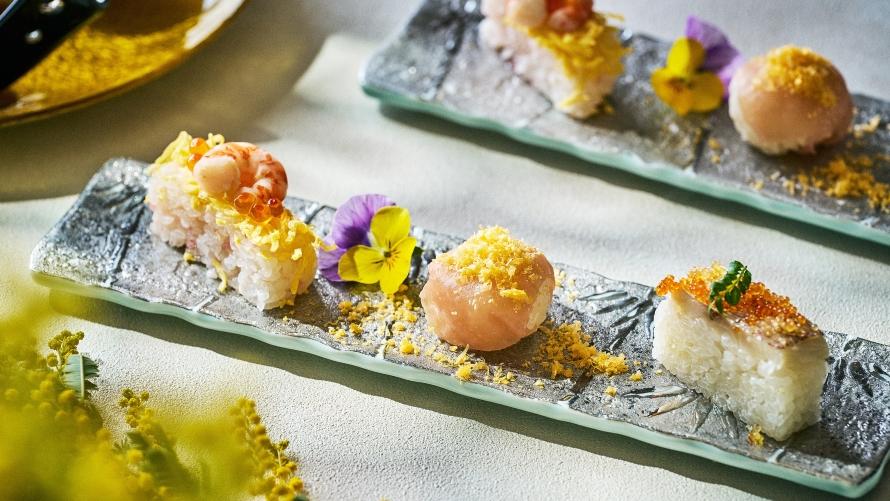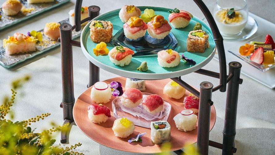 春の訪れを告げる花のひとつにも挙げられる「ミモザ」をテーマにした和のアフタヌーンティー。大トロや、ウニを乗せた中トロなどを含む手毬寿司に加え、車海老と錦糸玉子にイクラをのせた押し寿司や、ミモレットチーズでミモザのふんわりとした柔らかさを表現した生ハム手毬寿司などをご用意いたしました。