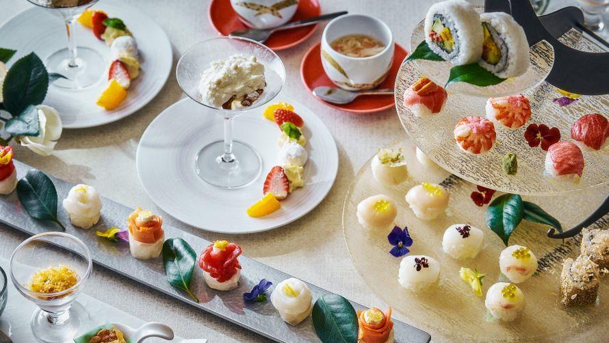 「冬の日本庭園」をテーマにした季節を味わう和のアフタヌーンティー。大トロや、雲丹を乗せた中トロなどを含む手毬寿司に加え、雪の中に咲く椿をイメージしたアレンジ寿司やズワイ蟹をたっぷりとのせた茶わん蒸しなどをご用意いたしました。ご家族やご友人と冬のジャパニーズアフタヌーンティーをぜひお楽しみください。