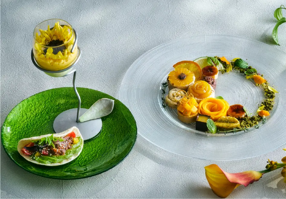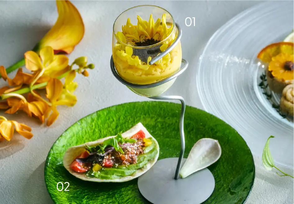 豆乳クリームに枝豆のペーストを加え、エディブルフラワーでヒマワリをデザインしたムース。ほうれん草のトルティーヤで大豆ミートやアボカド、トマトなどを包んだタコスと共にお楽しみください。