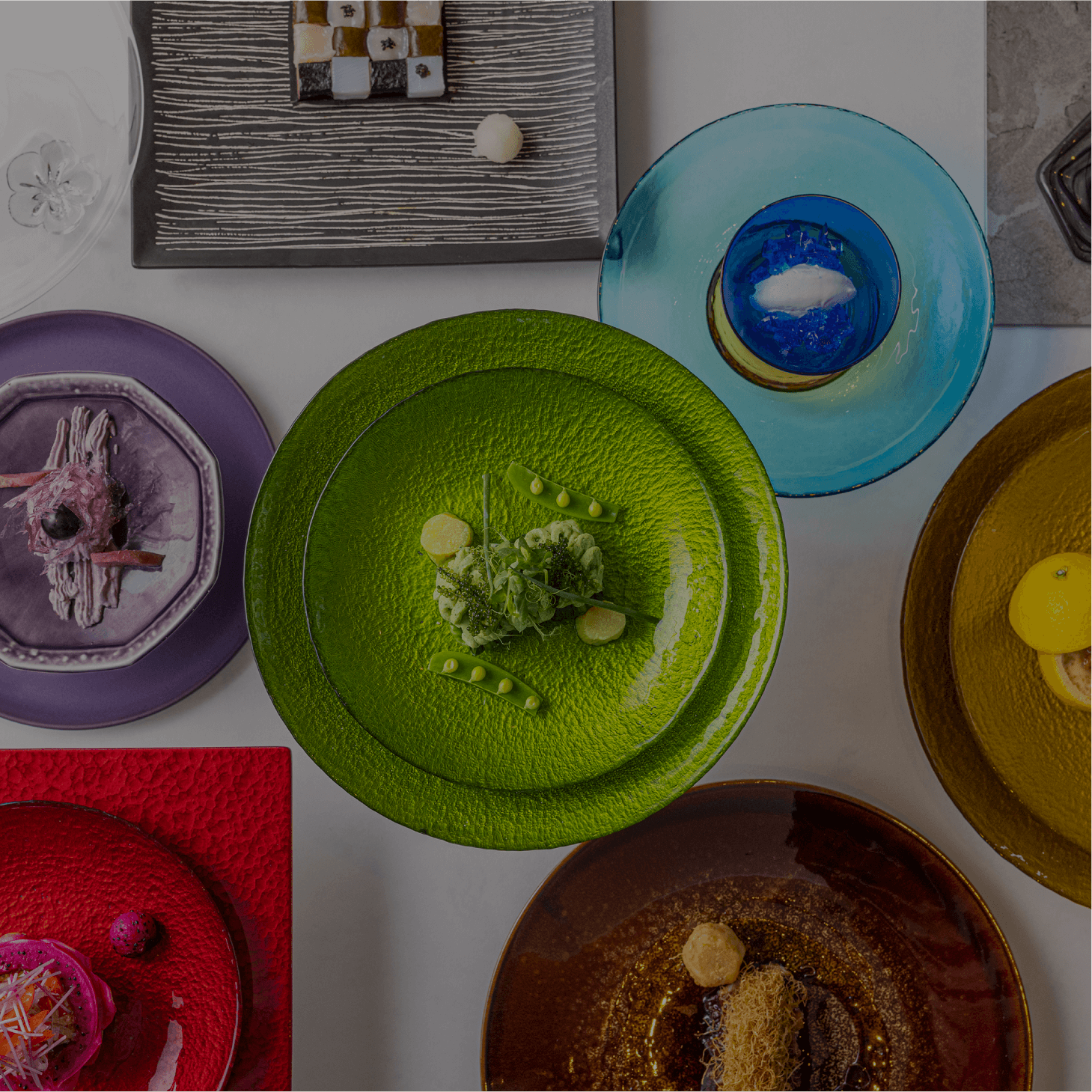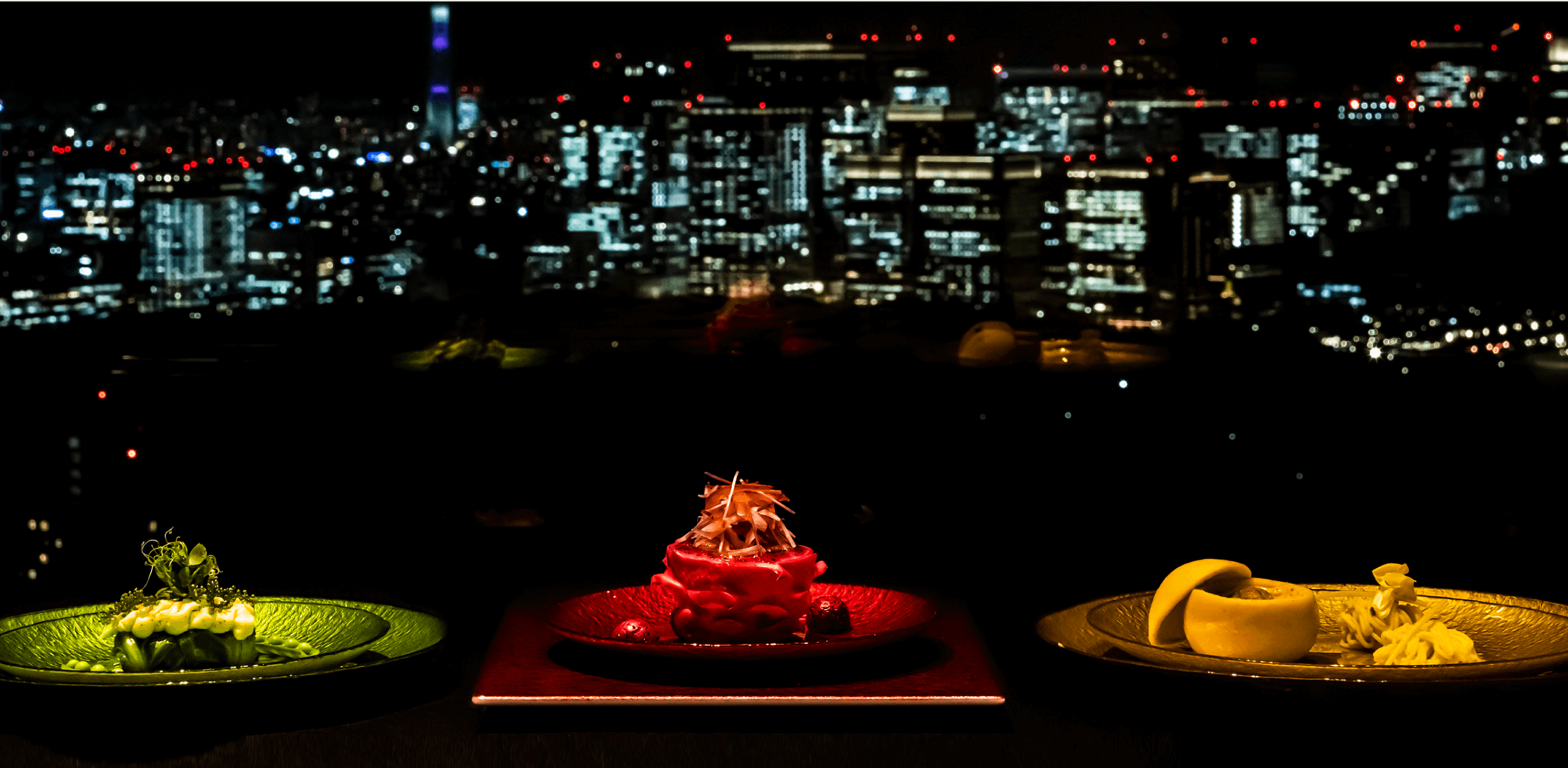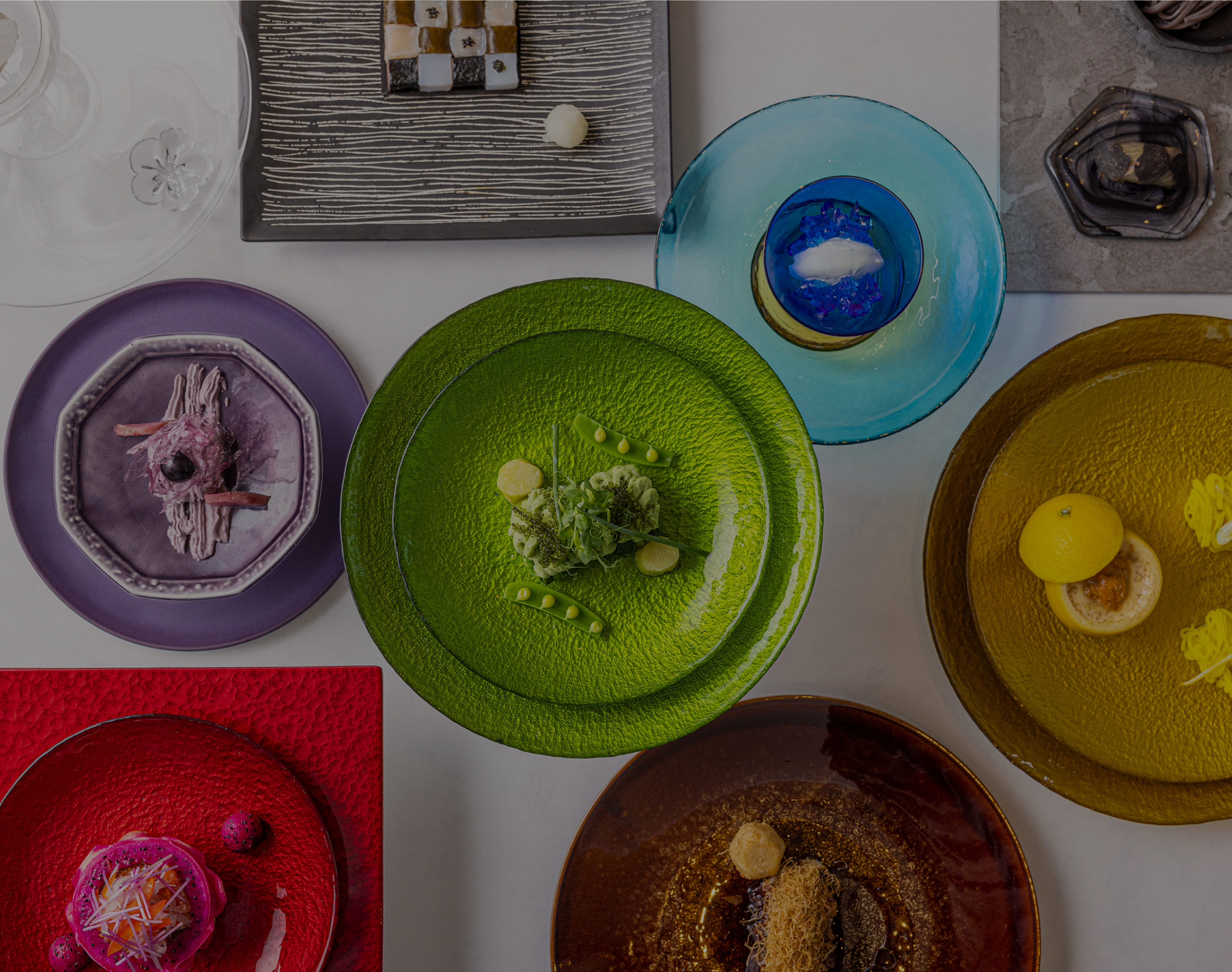 九つの“色”で表現した“見えないWASHOKU”コースを絶景とともに。色とりどりの美しい器に、料理長 髙橋 賢こだわりの料理が溶け込む新感覚との出会い。五感を研ぎ澄まし楽しむ、センセーショナルな食体験をご堪能ください。